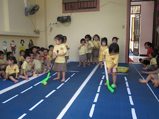 Trò chơi chia làm hai đội ,các bé sẽ dùng cây gậy đưa bóng theo bóng theo vạch đừơng quy định.